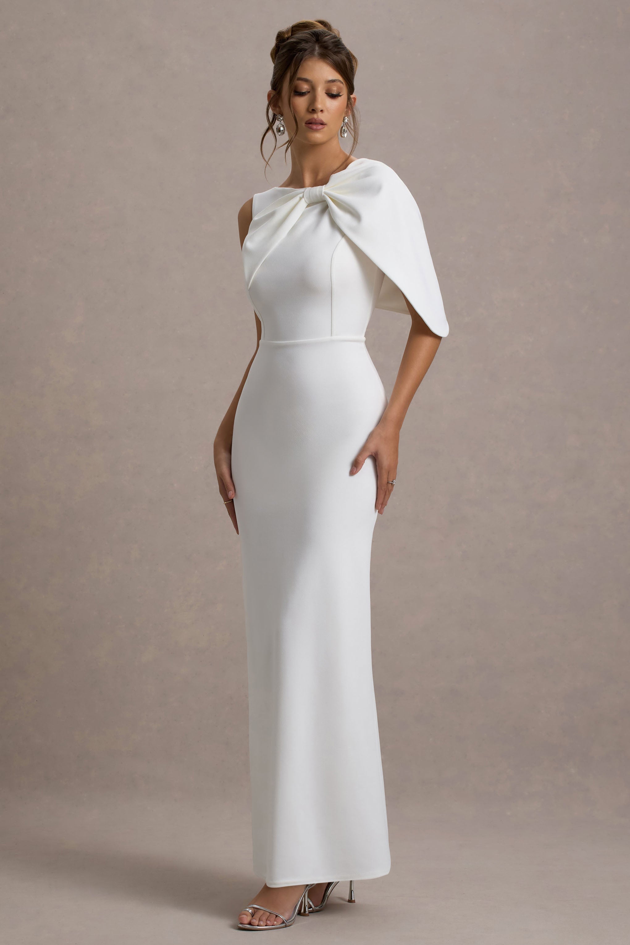 Make a lasting impression with Jamela, a striking one-sleeve maxi dress that exudes contemporary elegance. Crafted from our premium scuba crepe in white, this dress features a sleek, asymmetrical design that commands attention. Perfect for glamorous events,?Jamela pairs beautifully with metallic heels and statement accessories for a show-stopping finish.
