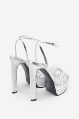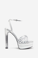 Channel glamour in our platform heels Mirror Mirror, coated with a silver metallic snake-effect finish and lace-up ankle strap. The perfect party-ready shoe, Mirror Mirror is completed with padded soles to ensure maximum comfort at your next cocktail or birthday event.?